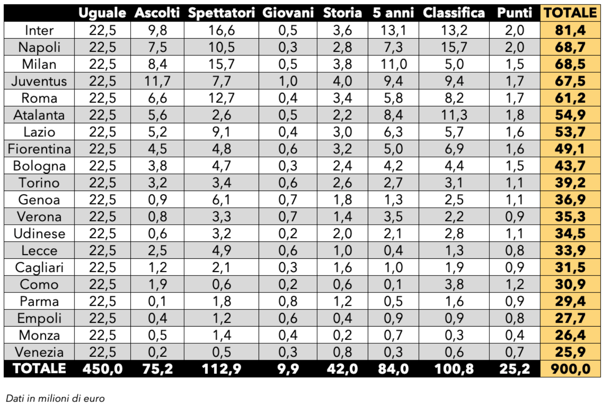 W sezonie 2024/2025, Lega Serie A rozdysponuje około 900 mln euro netto. Bazując na wcześniej wymienionych kryteriach, 450 mln zostanie równo podzielone pomiędzy wszystkie kluby, 100 mln zostanie przydzielone na podstawie końcowej pozycji w tabeli, 25 mln będzie związanych z punktami w tabeli. Kolejne 84 mln zostaną rozdysponowane na bazie wyników z ostatnich pięciu lat, a 42 mln uwzględnią kontekst historyczny. Z kolei jeśli chodzi o część opartą na korzeniach społecznych, to 10 mln będzie podzielone z tytułu minut rozegranych przez młodych zawodników, 113 mln na bazie frekwencji na stadionach i 75 mln w oparciu o dane z oglądalności telewizyjnej.